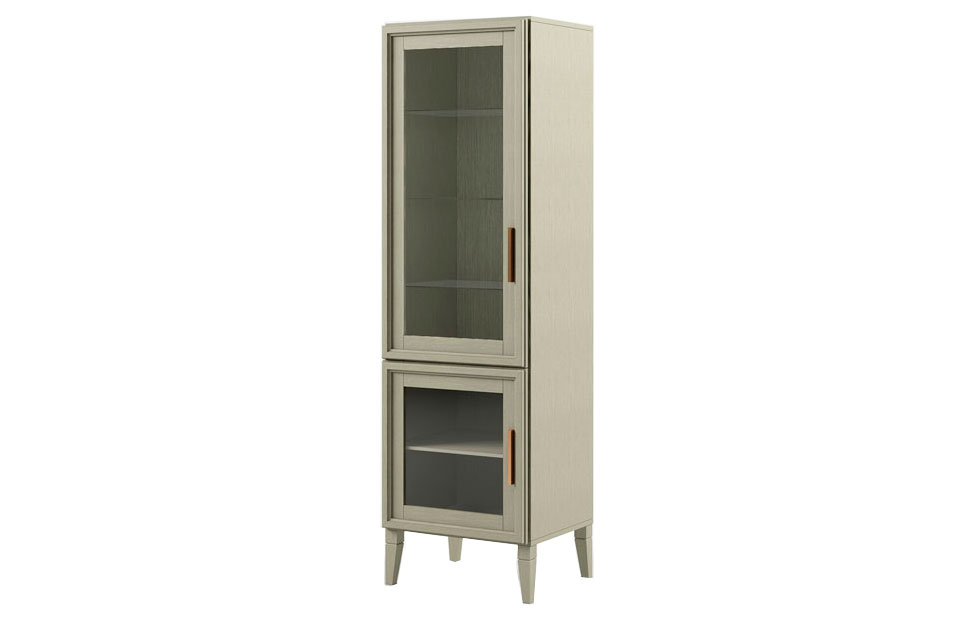 - В нижней части за распашной стеклянной дверцей одно отделение со шпонированной внутренней полкой, в верхней части за распашной стеклянной дверцей отделение с тремя стеклянными полками;