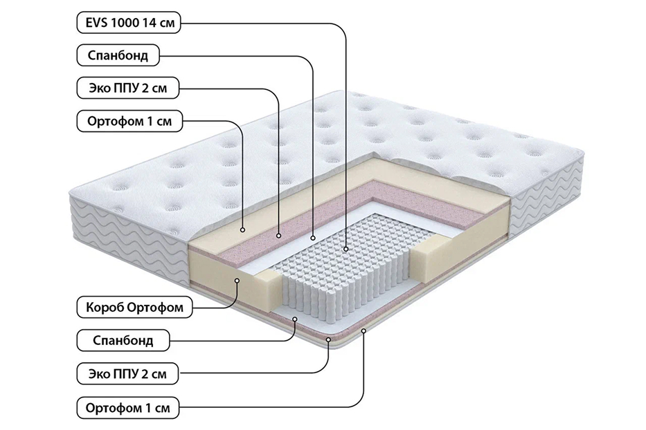 Матрас на основе интеллектуального блока независимых пружин обеспечивает необходимую поддержку каждого участка тела спящего. Матрас двусторонний. Жесткость средняя с обеих сторон. Сочетание современных высококачественных материалов Ортофом и Эко ППУ придает матрасу оптимальную среднюю жесткость. Защитным слоем при взаимодействии с независимыми пружинами служит спандбонд. Чехол матраса выполнен из трикотажной ткани, простеганный на дополнительном слое Ортофом.
